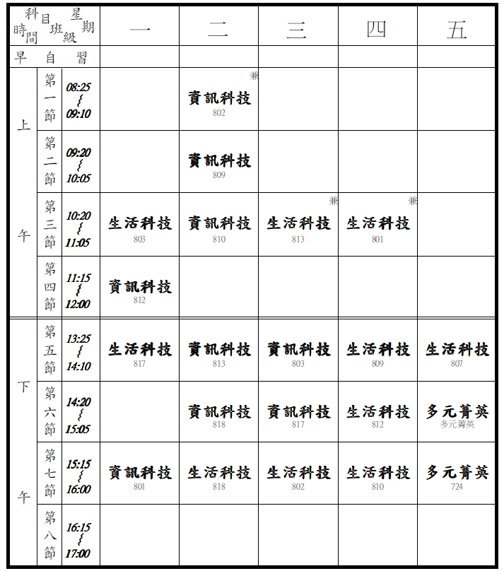 介壽國中徵求短期代課老師 學校:介壽國中地址:臺北市松山區延壽街401號科別:八年級生活科技、資訊科技,課表如附件節數:代課節數4-7節,可任選時段與科別期間:約3個月 (2/20週一 至 約5月底)鐘點費:每節378元需求:1.大學畢業。2.具備專業知能的相關系所學生。3.可選擇個人方便時間,代課時間可再議。聯絡人:若有意願者,請洽教務處 蔡主任 2767-4496轉200 或 張組長 2767-4496轉201。 Post author:吳宜庭 Post published:2023-02-13