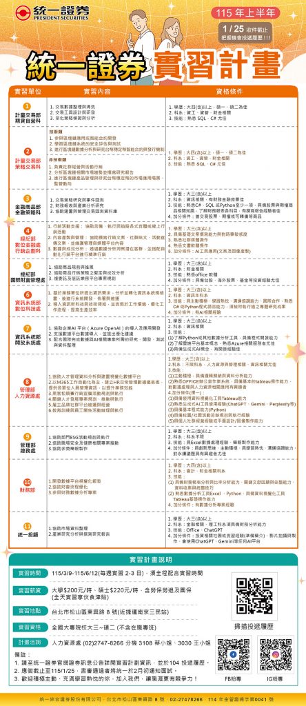 我們是統一證券,承蒙貴系所對統一證券的支持,來信係告知您統一證券「115年上半年實習計劃」招募開跑囉!